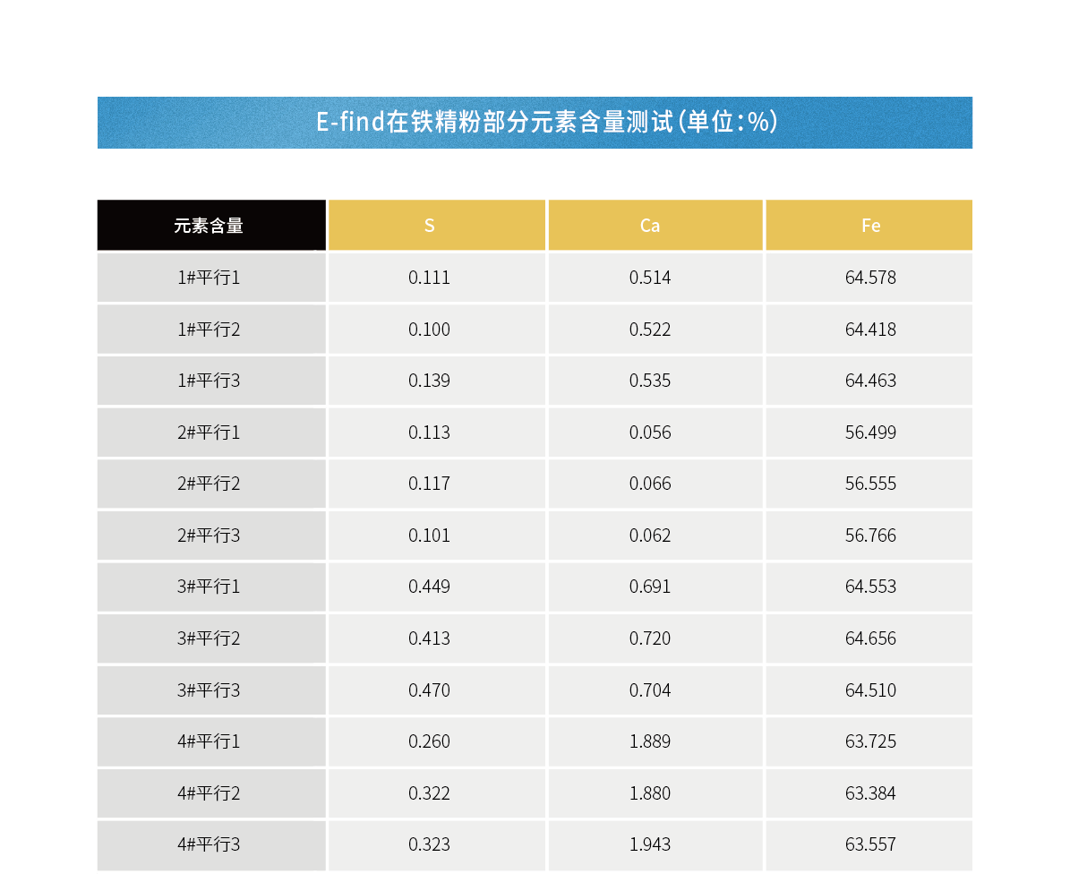 E-find系列仪器可以针对各种类型的矿物通过基本参数法对基体进行校正,且只需简单制样就可以得到高精度的测试结果,与实验室测试结果高度一致;可以针对各种类型的矿物及矿物中多种元素进行高精度分析,可高效快速进行原料或矿样品质评价。