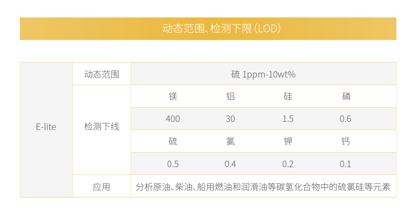 E-lite 具有先进的软件功能和数据管理系统,可以进行简单而直观的 操作。 借助全新软件,E-lite 可以存储 3 0 个校准数据集,并可提供线性和 二次曲线。 借助数据管理,存储成大量测量值、通过 USB 传输数据和实现 LIMS 集成将变得非常容易。可通过USB等方式传输数据,实现 LIMS集成;应用在分析原油、柴油、船用燃油和润滑油等碳氢化合物中的硫氯硅等元素,下图为E-lite的检出限。