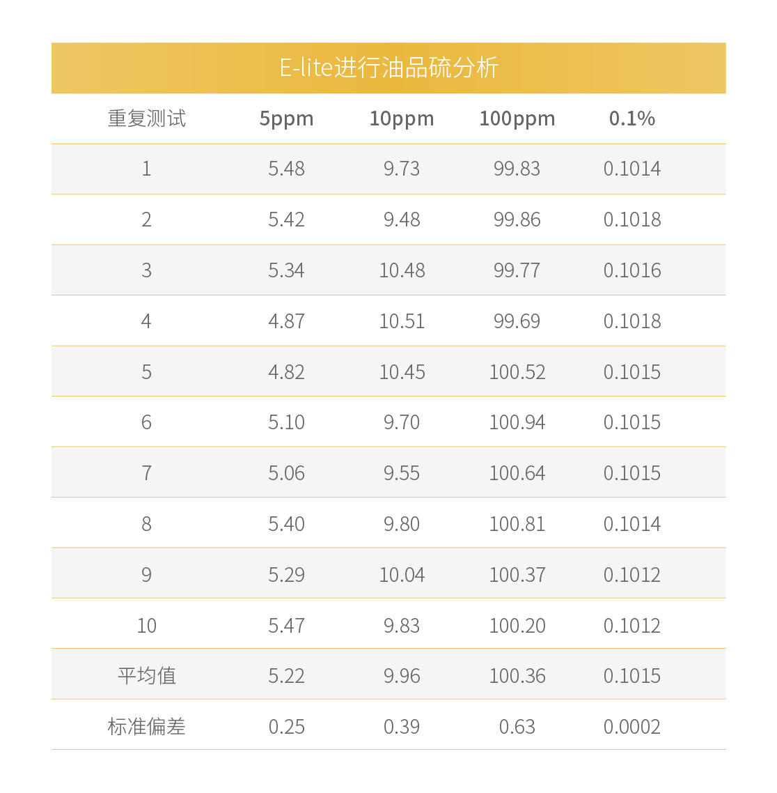 E-lite 符合 ASTM D4294 , ISO 8754 , ASTM D7220等 标准方法,可对原油、柴油、汽油、船用燃油和润滑油等 碳氢化合物进行硫分析。 E-lite的检出限低至0.5ppm,可提供精确的硫分析。下图中的数据表示E-lite 在分析的10 个单独的原油试样。