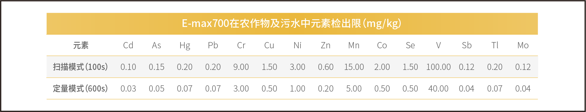 E-max700在农作物及污水中元素检出限(mg/kg)