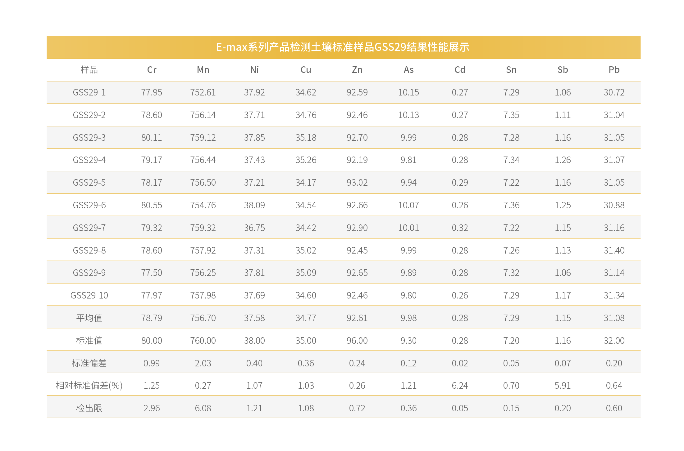 满⾜GB15618-2018中对⼟壤中重⾦属的筛查及管控要求,其中对 镉 的 合 规 要 求 是 0.3mg/kg, ⽽ E-max 系 列 检 测 极 限 可 以 达 到0.05mg/kg。