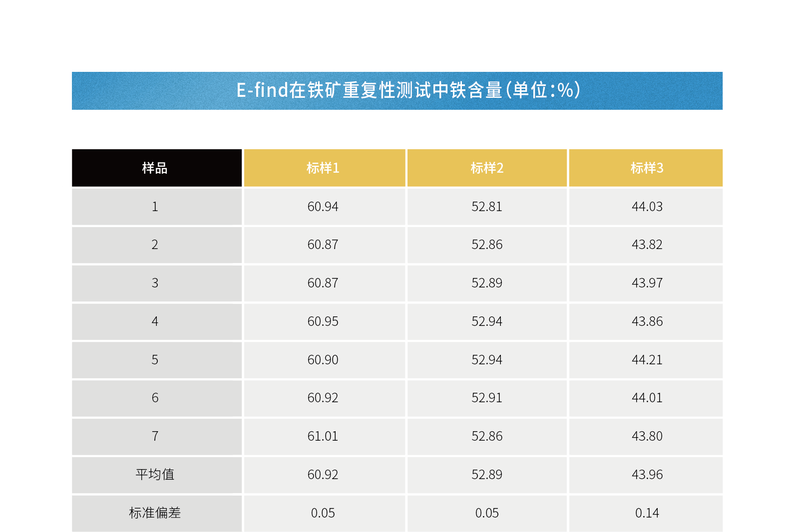 E-find系列仪器可以针对各种类型的矿物通过基本参数法对基体进行校正,且只需简单制样就可以得到高精度的测试结果,与实验室测试结果高度一致;可以针对各种类型的矿物及矿物中多种元素进行高精度分析,可高效快速进行原料或矿样品质评价。