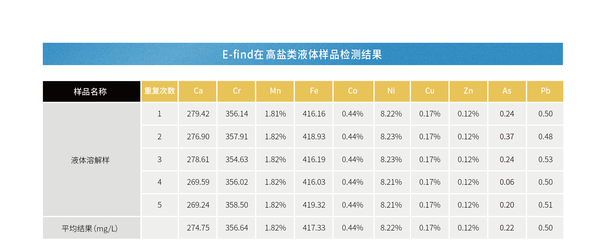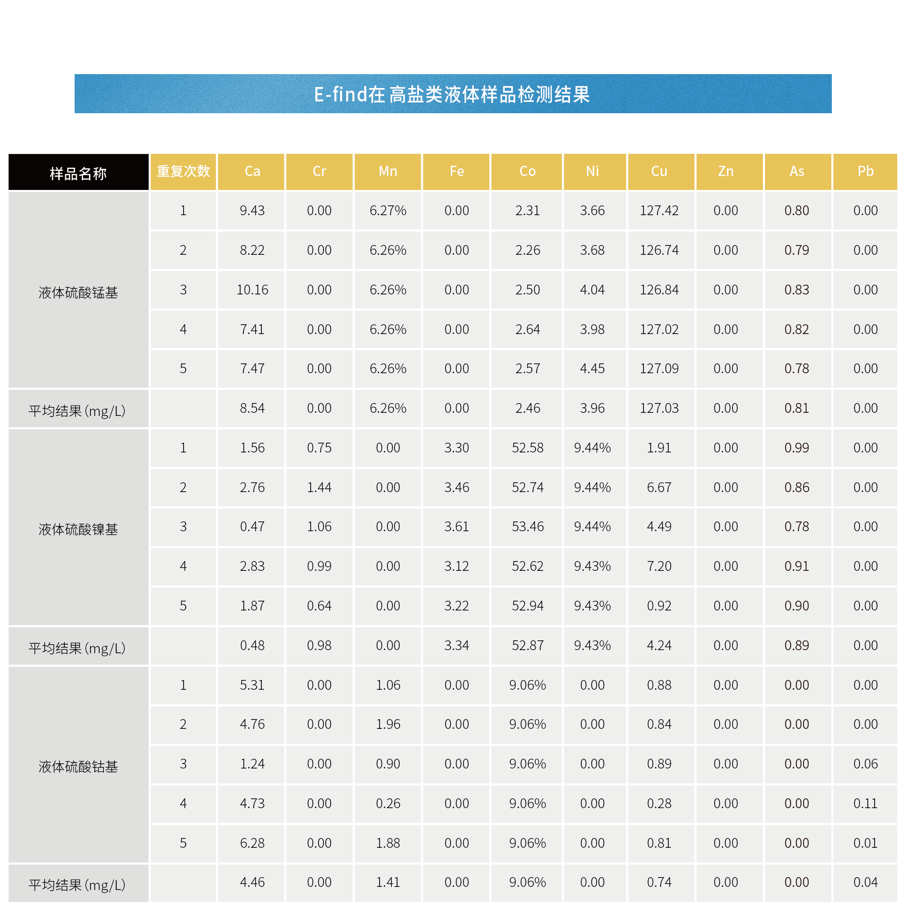 E-find系列仪器可以对新能源中的材料进行高精度分析。如三元锂电池中,可以应用于生产中控环节中原材料高冰镍萃取液、循环水废渣、废液前驱体等样品中的微量元素、主量元素进行准确定量分析;下列是E-find在高盐类液体样品重复检测结果,每个样品2次重复检测,每次检测时间为5分钟。