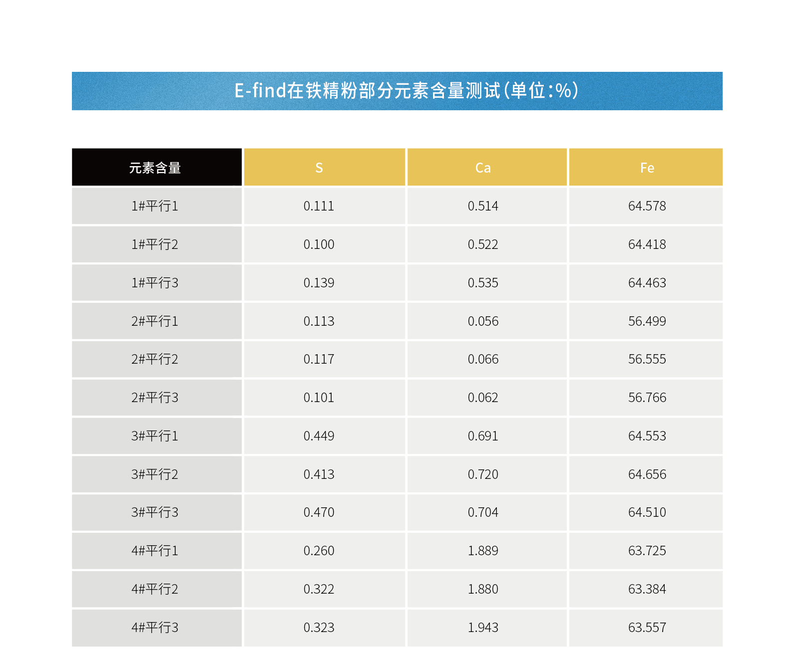 E-find仪器可以针对各种类型的矿物及矿物中多种元素进⾏⾼精度分析,可⾼效快速进⾏原料或矿样品质评价。