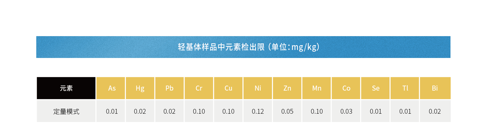 适用于As、Ba、Cd、Co、Cr、Cu、Fe、Hg、Mn、Ni、Pb、Pd、Sb、Se、Sn、Ti、Tl、V、Zn等40余种元素快速检测;