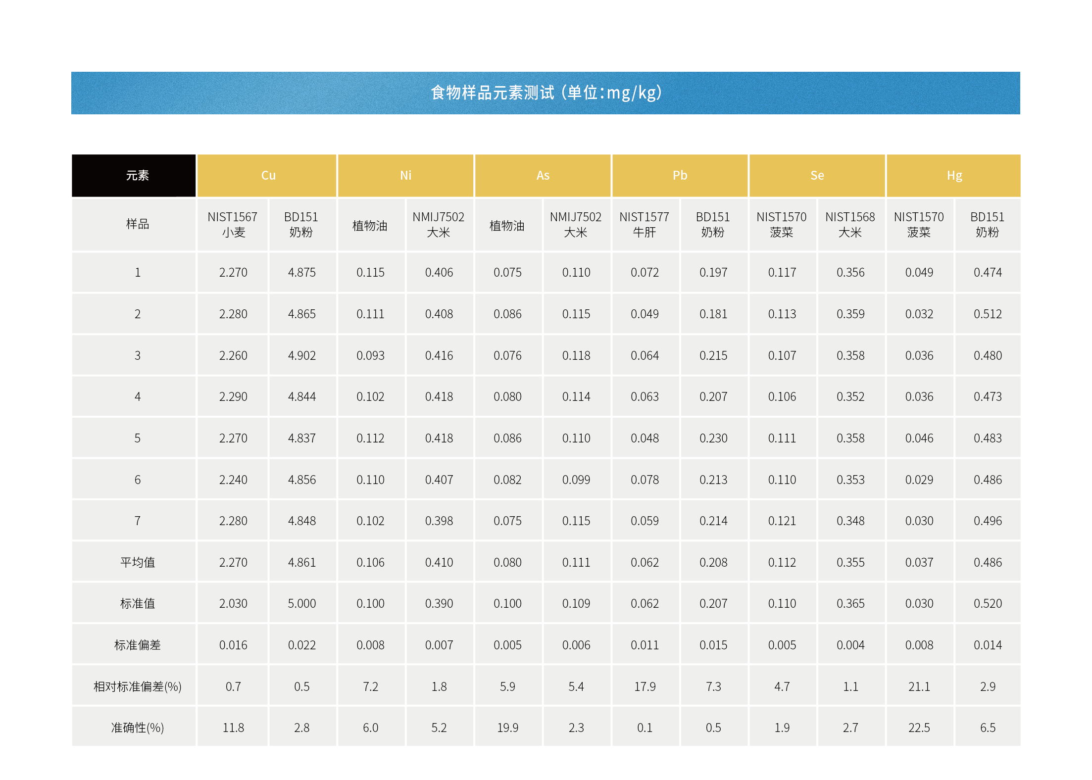 选取若干标准样品, 对其中多种金属元素进行直接分析,其测量准确性与标准值的相对误差来考察仪器的测试准确性。